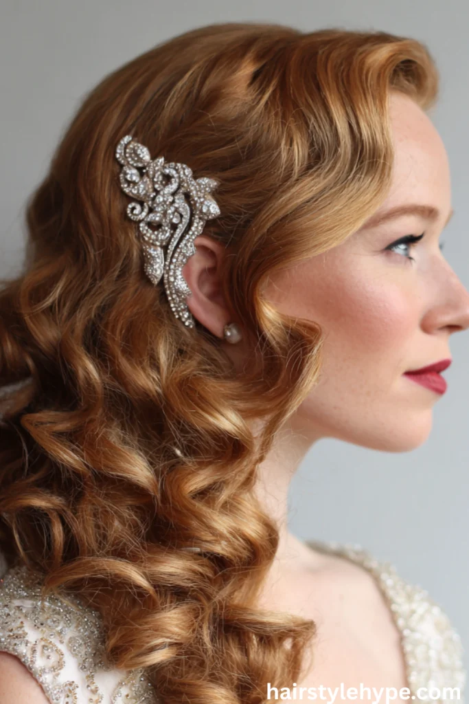 Sweep your curls to one side and secure them with a decorative hair brooch. This look oozes glamour and complements high-neck blouses or sequined dresses beautifully.