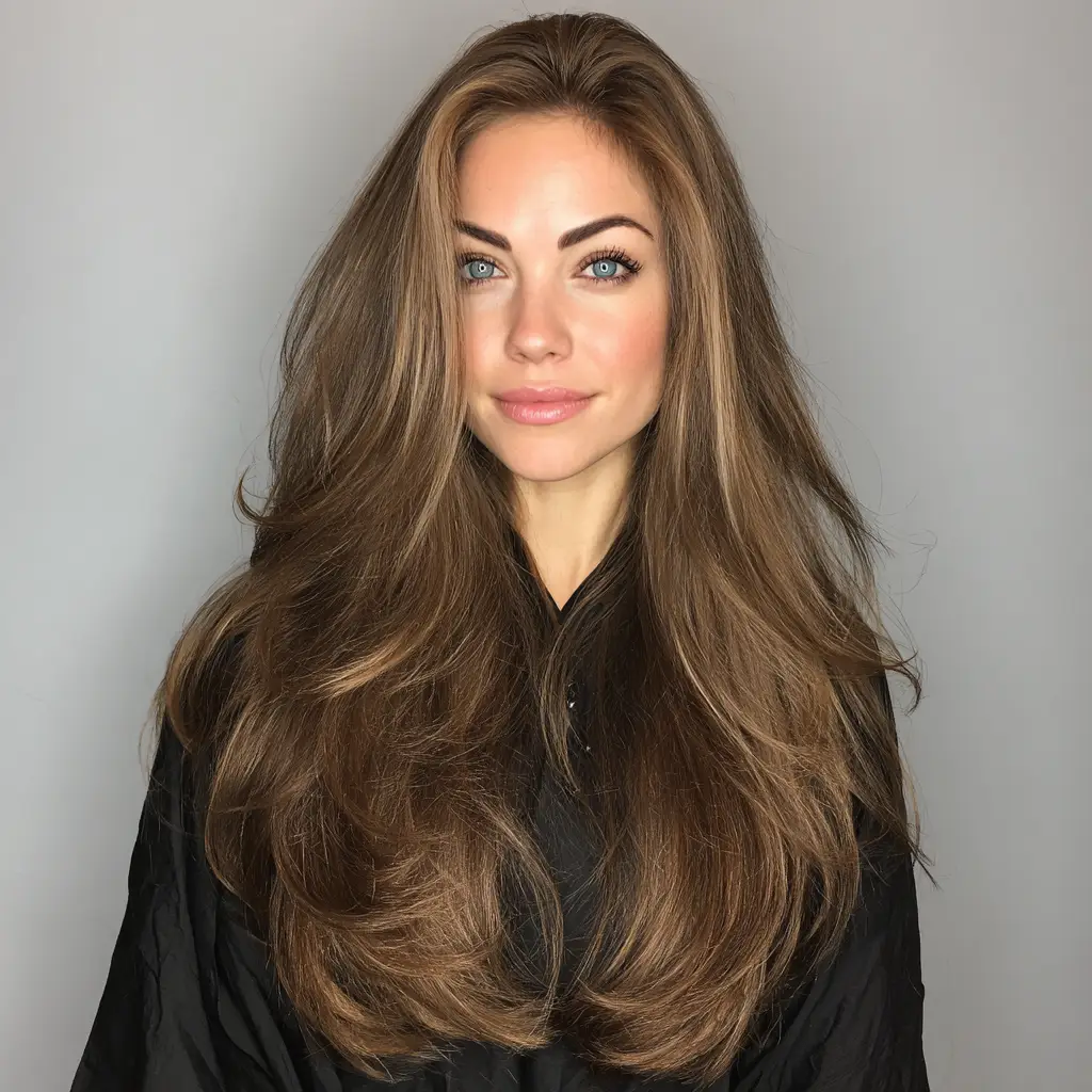 Super long layers styled in the 90s blowout look effortlessly glamorous, perfect for showcasing glossy, healthy hair.
